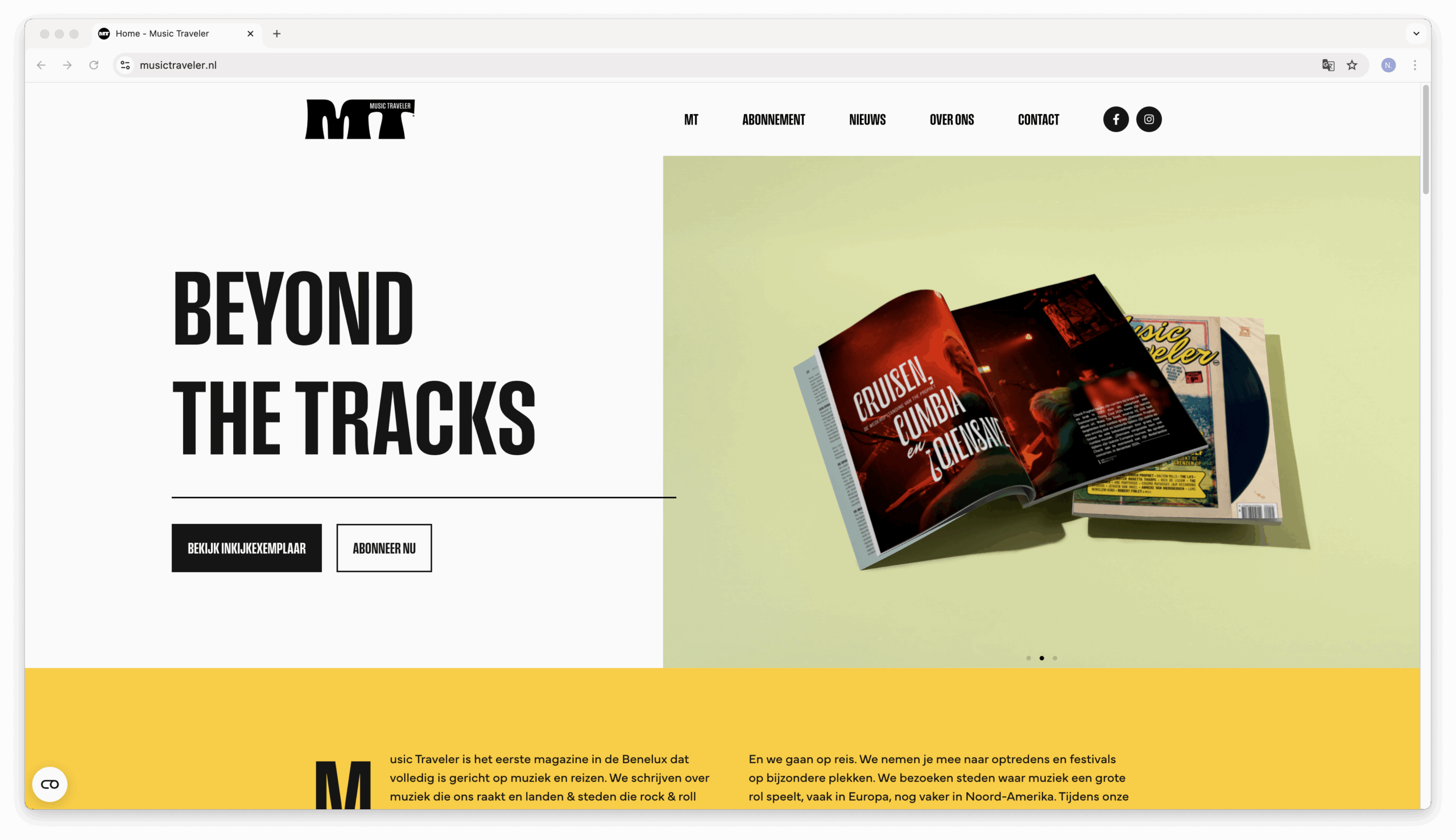 Een online magazine over wereldwijde muziekstijlen en -culturen vraagt om een platform dat net zo veelzijdig is als de muziek zelf. Music Traveler wilde een website die hun magazine op de kaart zet en tegelijkertijd uitnodigt om abonnee te worden. Wij ontwikkelden een visueel prikkelende, ritmisch opgebouwde website die nieuwsgierigheid wekt en aanzet tot actie. Van nieuws tot niche: elke genreliefhebber vindt hier zijn sound. Nieuwsgierig hoe we dit hebben aangepakt? Bekijk de website!