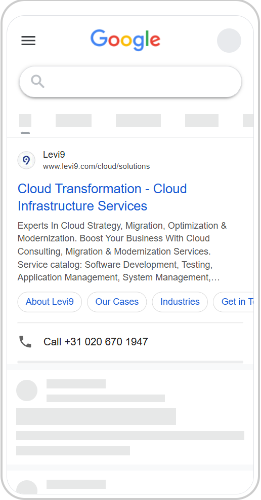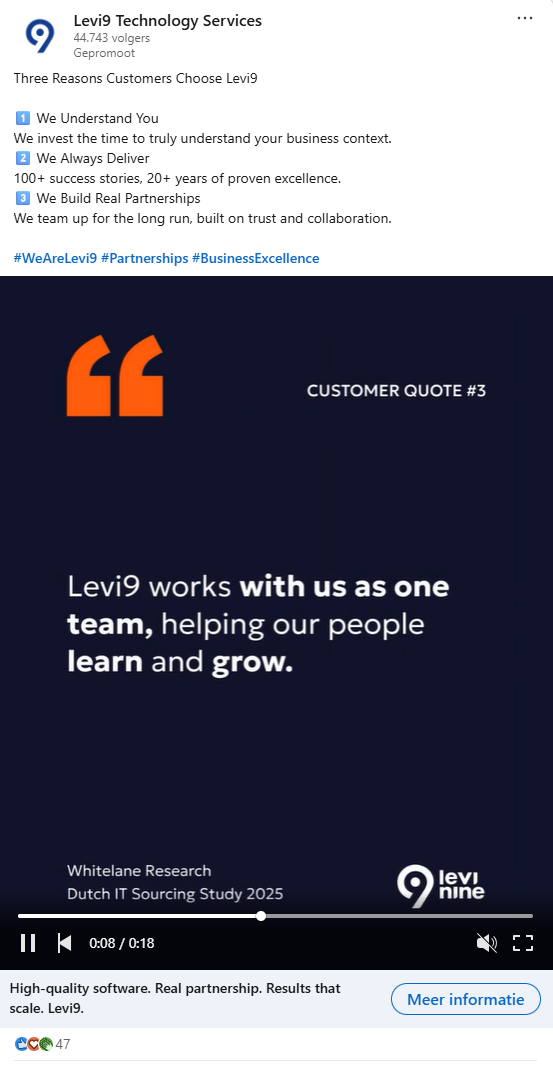 Voor Levi9 verzorgen we de online marketing met een focus op Google Ads, LinkedIn Ads, Meta retargeting en SEO. Via Google Ads spelen we in op concrete zoekopdrachten, terwijl we ons via LinkedIn Ads richten op decision makers binnen relevante sectoren.